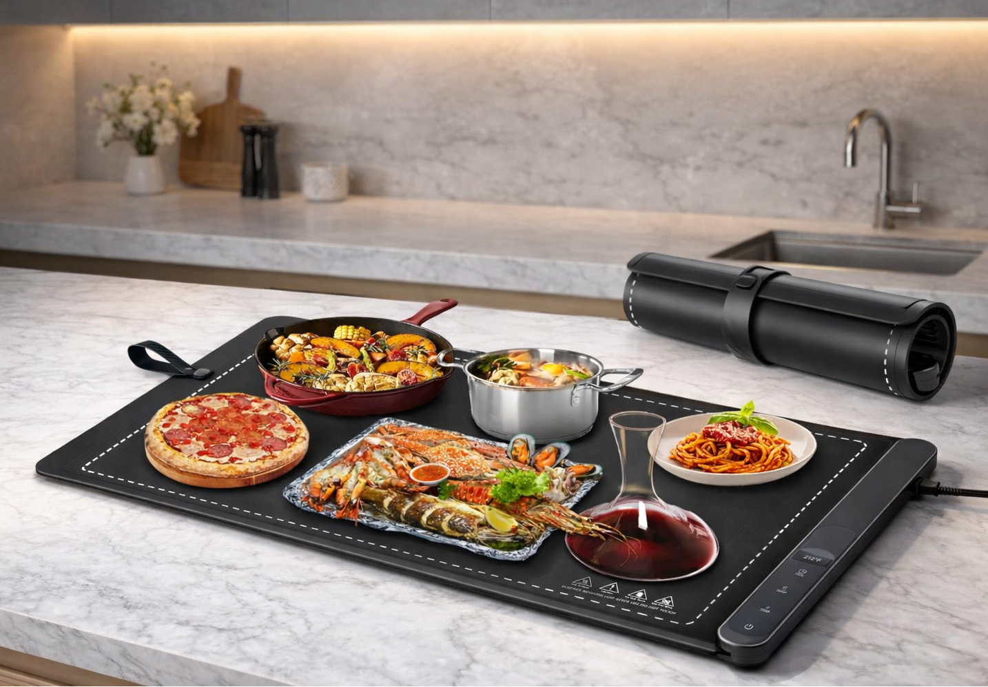 Keep your meals perfectly warm with KeepItWarm™, a flexible silicone warming mat powered by fast graphene heating. Designed for everyday use, it delivers even heat, adjustable temperature levels, and easy roll-up storage—combining modern design, efficiency, and convenience for a better dining experience.